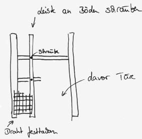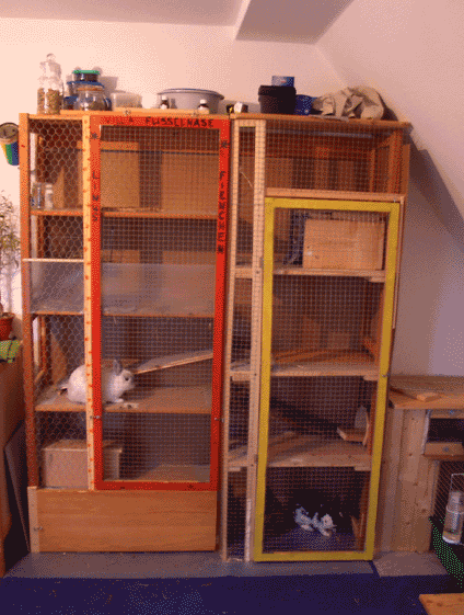 Rechts sieht man den Anbau des handelsüblichen Käfigs, der senkrecht zum selbstgebauten steht. Dort ist eine Zimmerecke und er passt tatsächlich unter eine Dachschräge, die sonst nicht genutzt würde.
